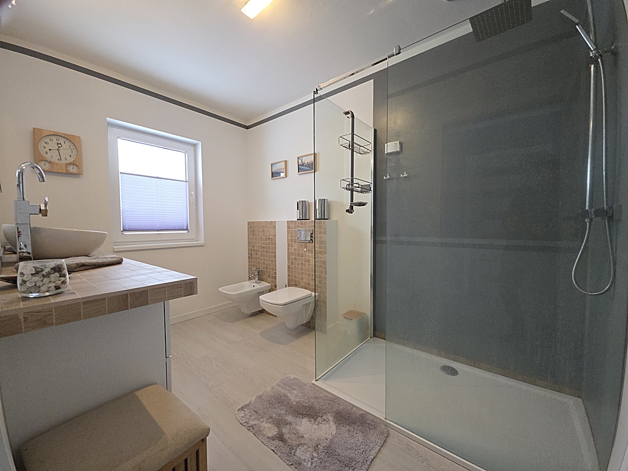 - Nowoczesna łazienka z WC, w której znajduje się duża kabina prysznicowa typu walk-in, bidet oraz elegancka umywalka nablatowa.
