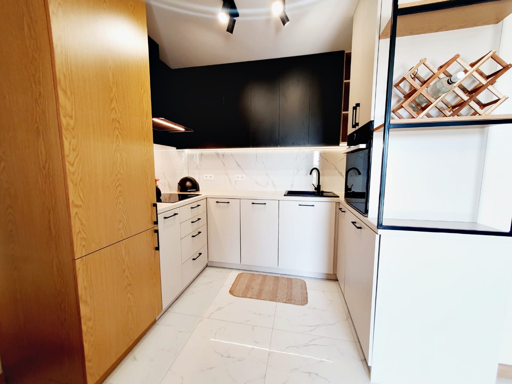 Kuchnia w zabudowie pod wymiar wyposażona została w lodówkę, zmywarkę, pralkę, piekarnik, płytę indukcyjną oraz okap kuchenny.
