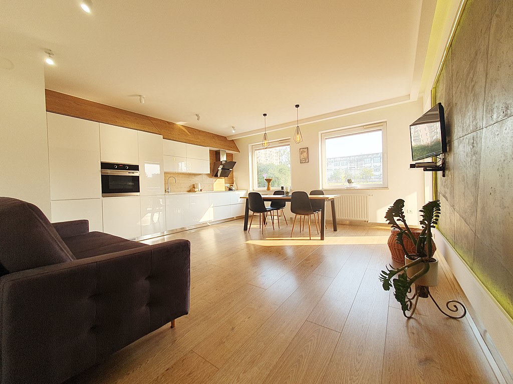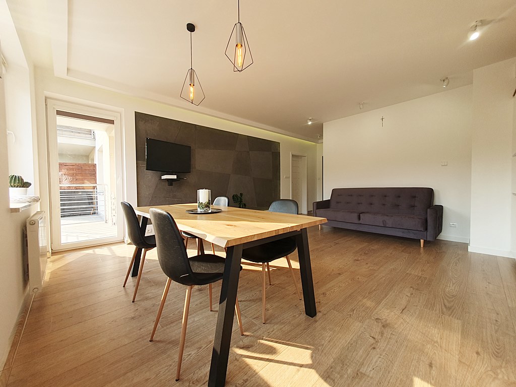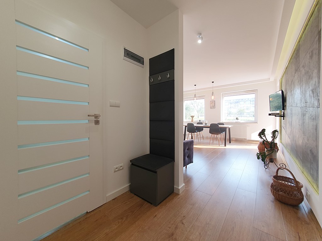 Mieszkanie środkowe jednostronne - rozkładowe umeblowane i wyposażone. Przestronny salon połączony został z aneksem kuchennym wyposażonym w niezbędny sprzęt AGD (lodówka, płyta grzewcza, piekarnik, okap, zmywarka). W łazience znaleźć można wannę z funkcją prysznica oraz pralkę. Do mieszkania przynależy taras, połączony z sypialnią i salonem. Nieruchomość w podwyższonym standardzie, idealna dla osób ceniących sobie przestrzeń.