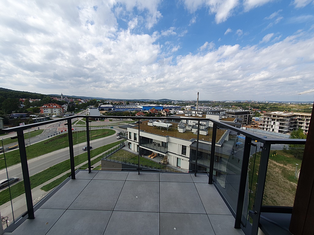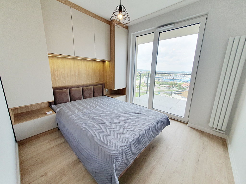 Mieszkanie narożne, dwustronne - rozkładowe, z ekspozycją północ, zachód. Wyposażone w wysokiej jakości sprzęt AGD (lodówka, zmywarka, okap, płyta indukcyjna, pralka). Salon połączony został z kuchnią, oraz z wyjściem na przestronny balkon, z ekspozycją na północ, z którego podziwiać można panoramę miasta. Drugą część miasta zobaczyć można, od strony zachodniej, dzięki drugiemu balkonowi umieszczonemu po stronie sypialni. W łazience znajduję się pralka, oraz prysznic. Osiedle Bella Vista, usytuowane zostało, w miejscu cichym, dobrze skomunikowanym z centrum Kielc, w którym odnajdzie się każda osoba ceniąca sobie spokój, oraz wygodę. Z okien apartamentowca podziwiać można tereny zielone, takie jak Telegraf, czy panoramę Gór Świętokrzyskich. W pobliżu znajduję się Rezerwat Przyrody Wietrznia.