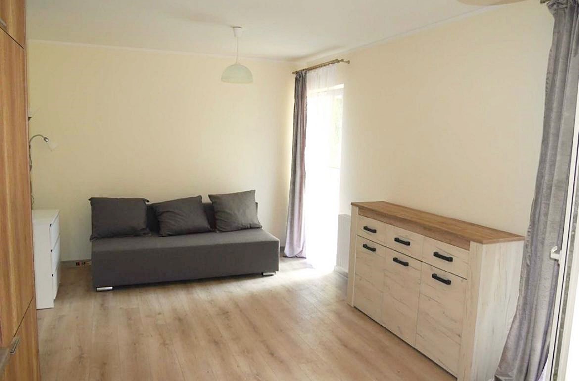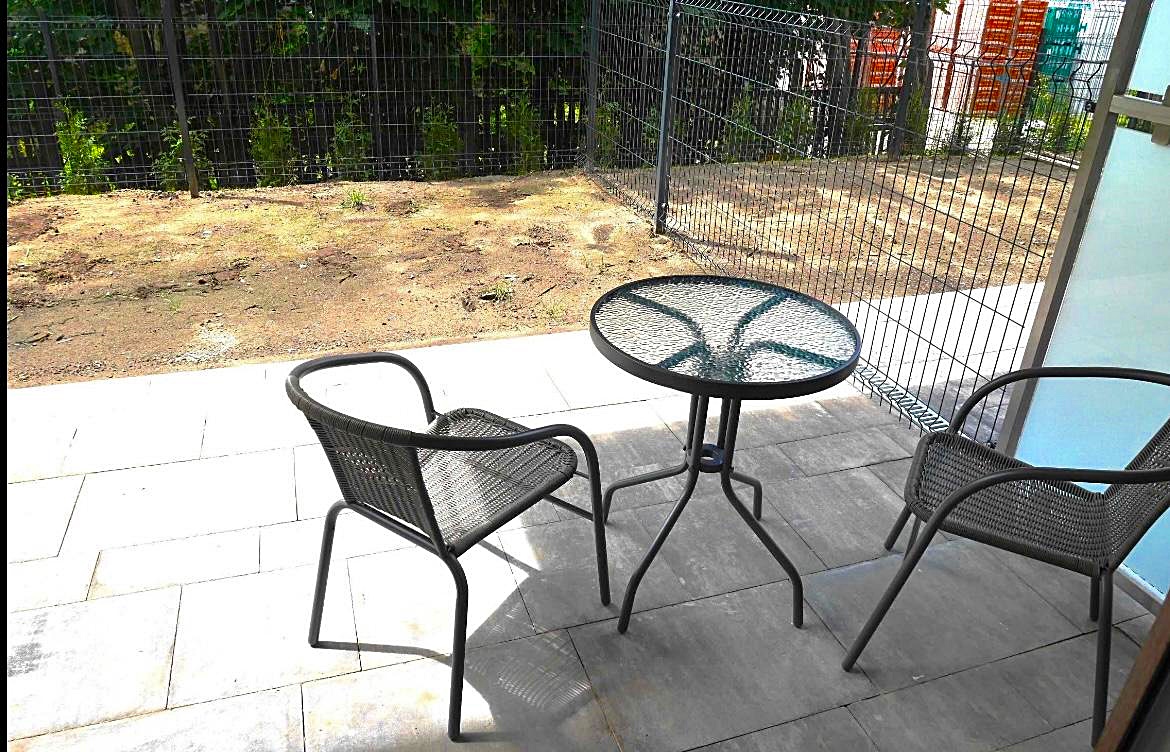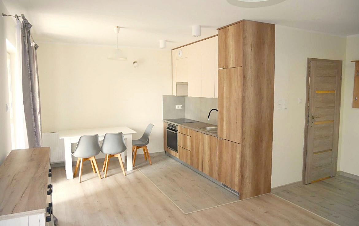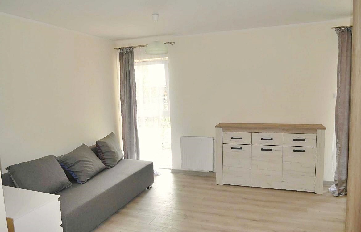 Mieszkanie środkowe jednostronne - rozkładowe. Lokal umeblowany i wyposażony w sprzęt AGD. Salon połączony został z aneksem kuchennym w skład, której wchodzi: lodówka, piekarnik, płyta grzewcza, okap. Atutem mieszkania jest przestronny ogród, biegnący po całej szerokości mieszkania (dwa wyjścia). Nieruchomość została zaprojektowana z myślą o funkcjonalności oraz wygodzie. Teren wokół budynku został ogrodzony, zabezpieczony domofonem. Dodatkowo wokół apartamentu, zainstalowany został monitoring.