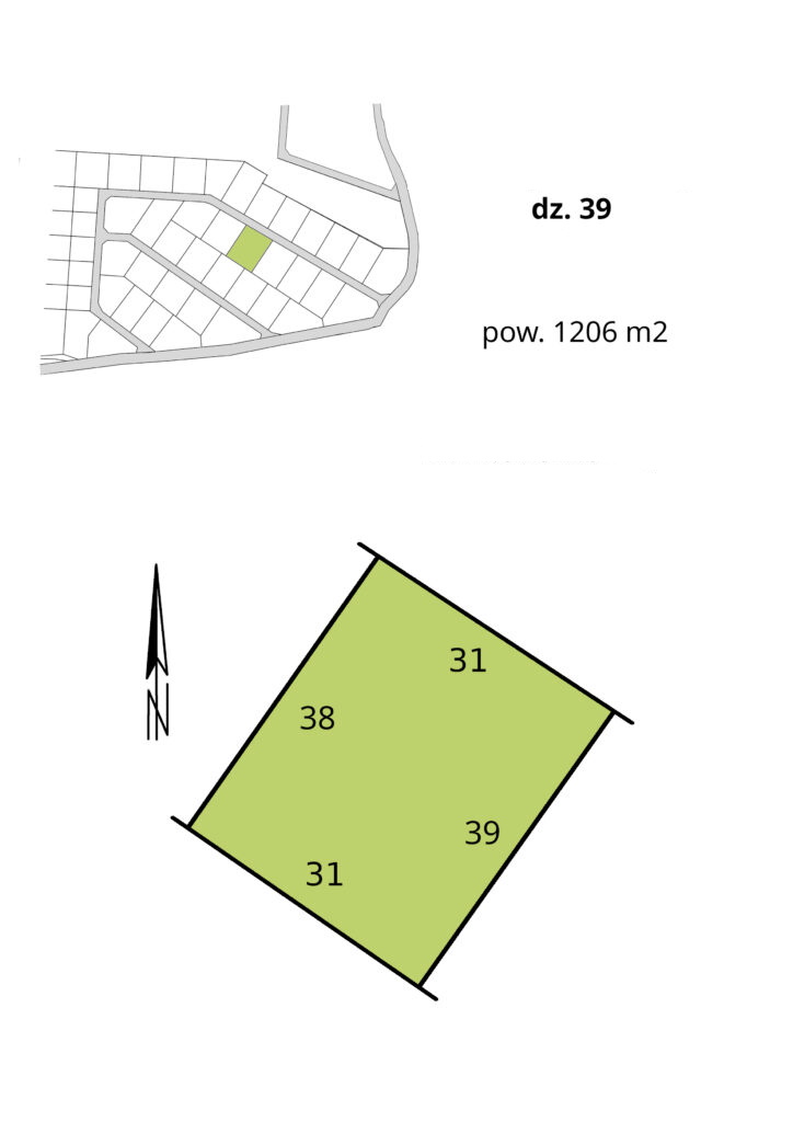 Działka stanowi część kompleksu 32 działek o powierzchniach od 10 ar do 14 ar (wszystkie objęte MPZP). Dojazd do działek odbywa się po drogach gminnych oraz po działkach będących drogami wewnętrznymi (udziały w drogach w cenie). Dostępne zarówno działki puste oraz z aktywnym pozwoleniem na budowę.
