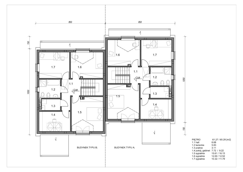 - piętro: hall, 3 sypialnie, pokój gabinet, pralnia, łazienka