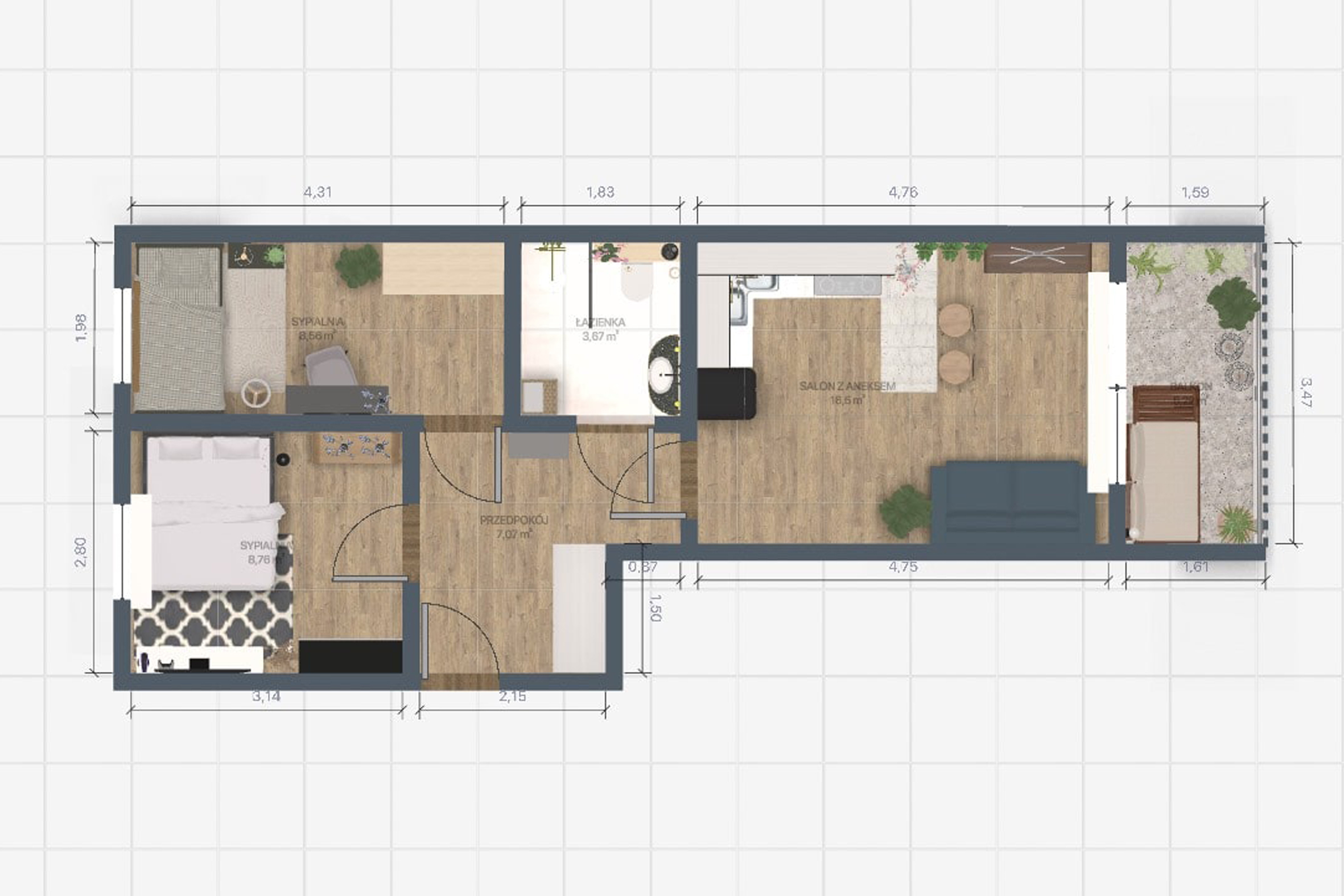 Przedstawione plany i wizualizacje mają jedynie charakter poglądowy oraz inspiracyjny. Zapraszamy do zobaczenia mieszkania na żywo.